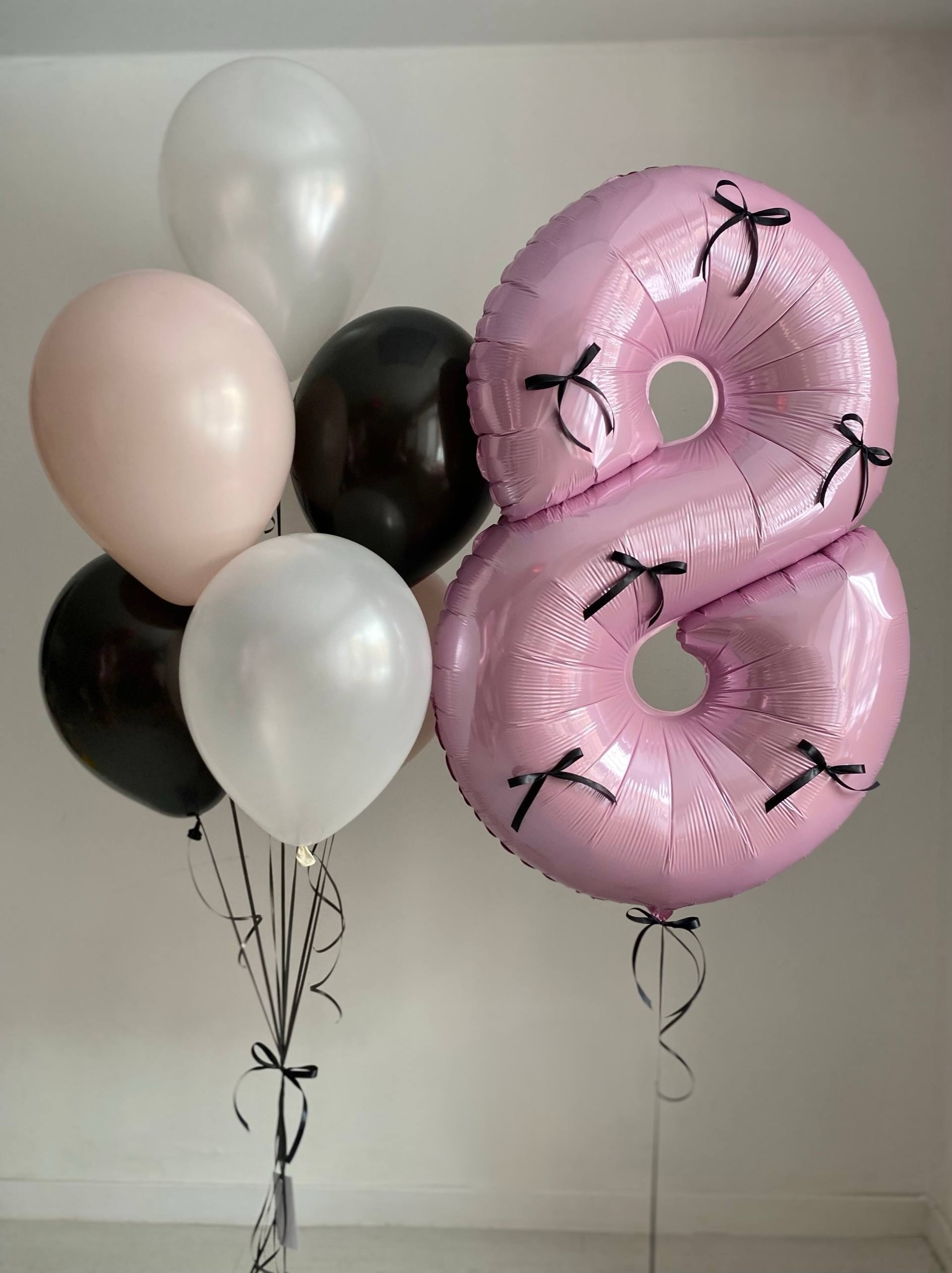 Воздушные гелиевые шары розовый/белый/черный бантики №4473