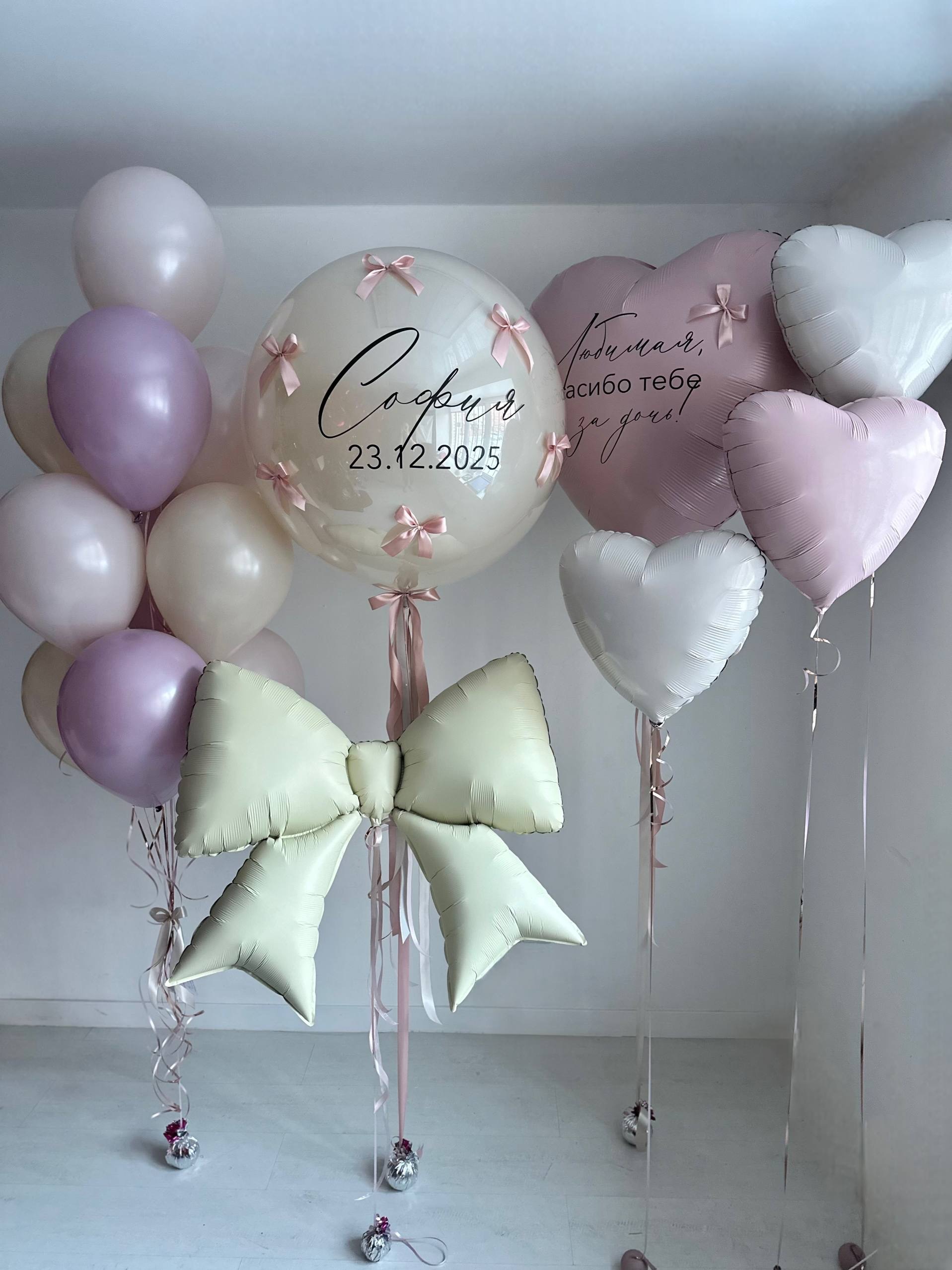 Воздушные гелиевые шары на выписку бант лаванда/песок/пыльная роза №4510