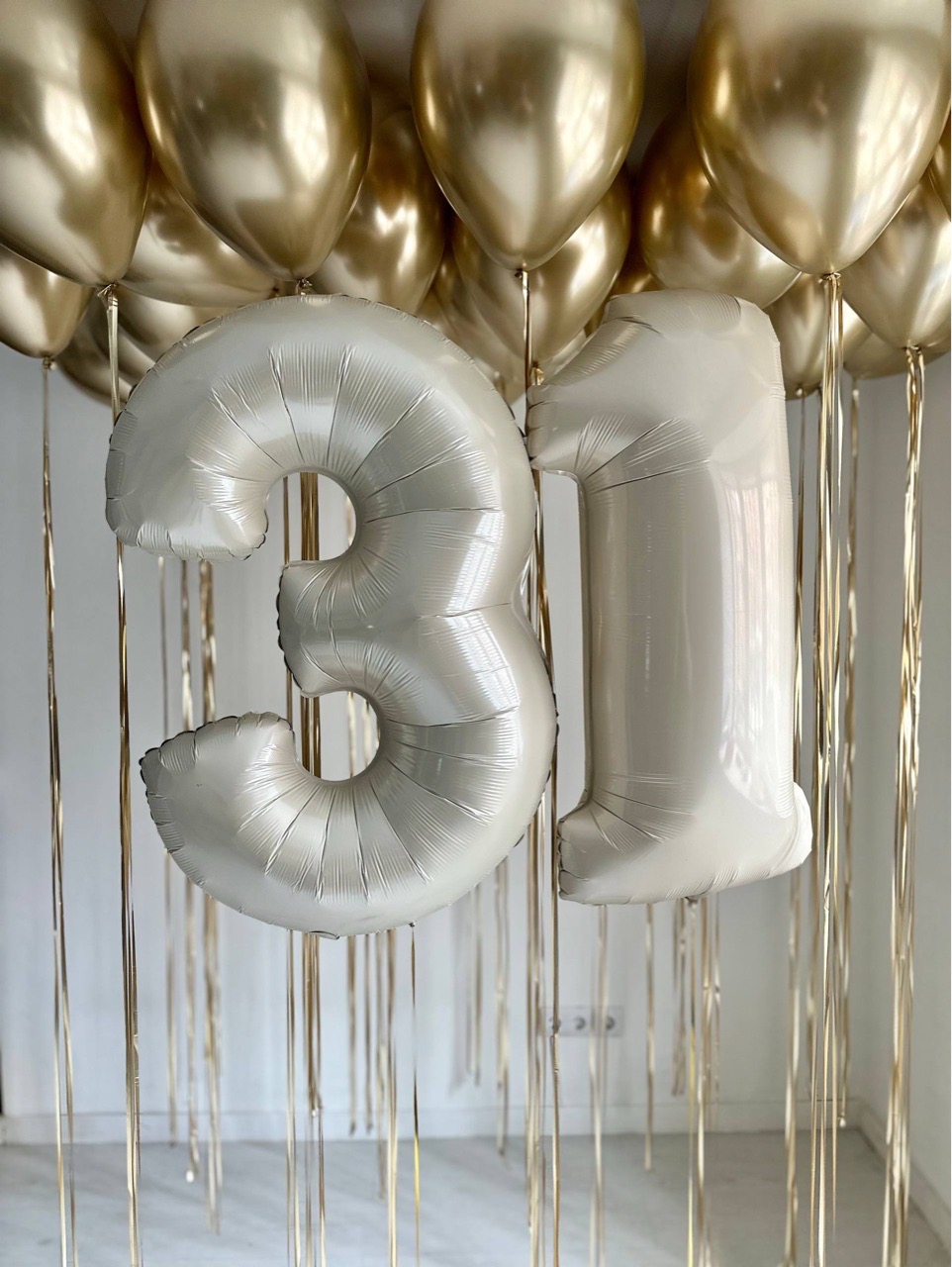 Воздушные гелиевые шарики под потолок хром золото на золотом дождике 31 год №4994