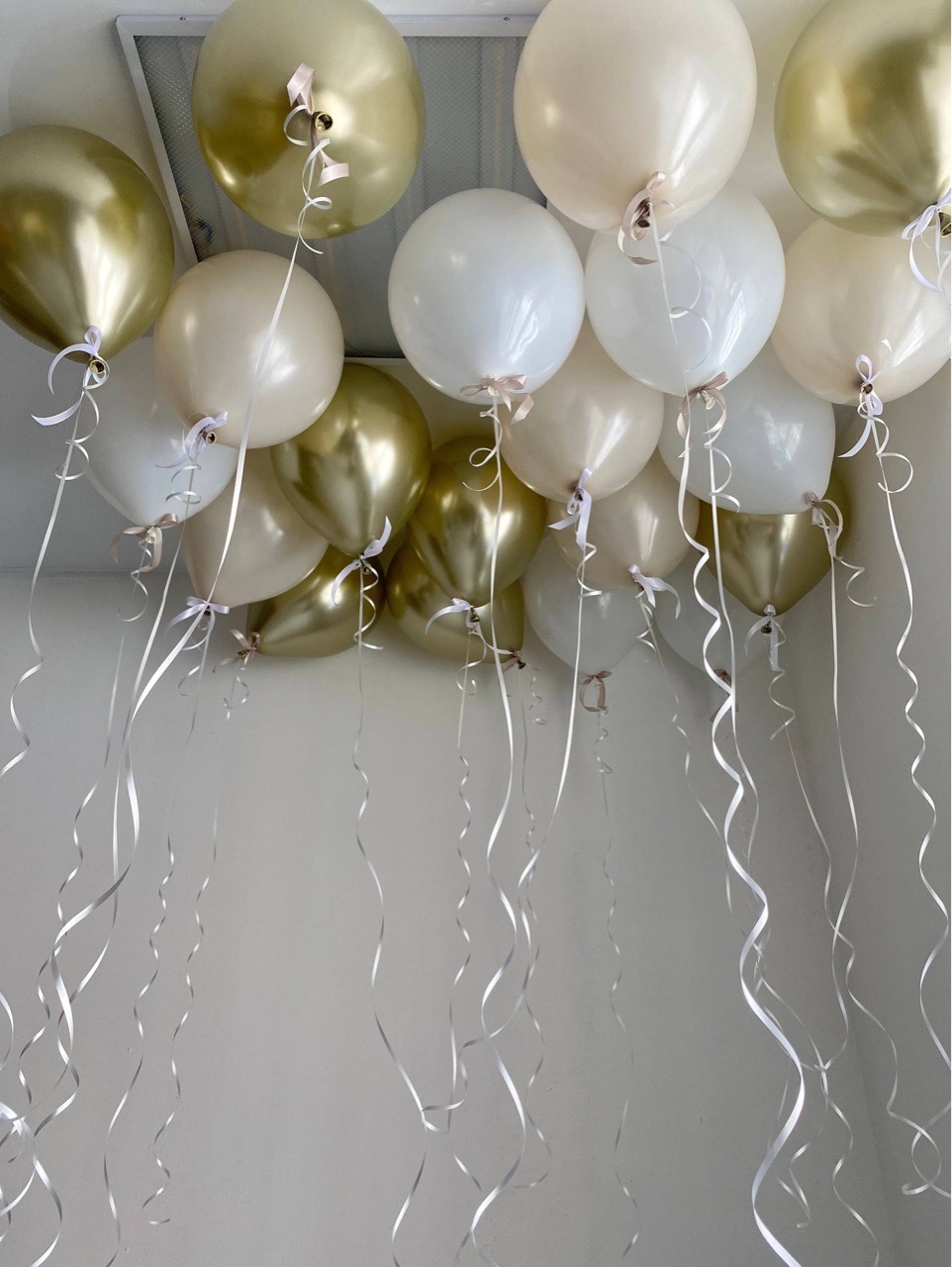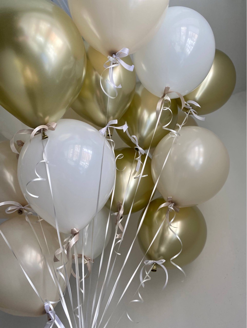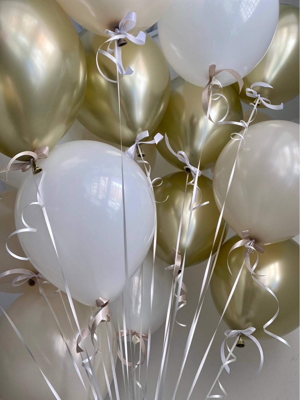 Воздушные шары под потолок хром золото/белый/песок бантики №5041
