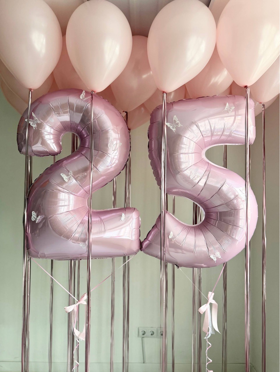 Воздушные гелиевые шары розовые на дождике бабочки №5089