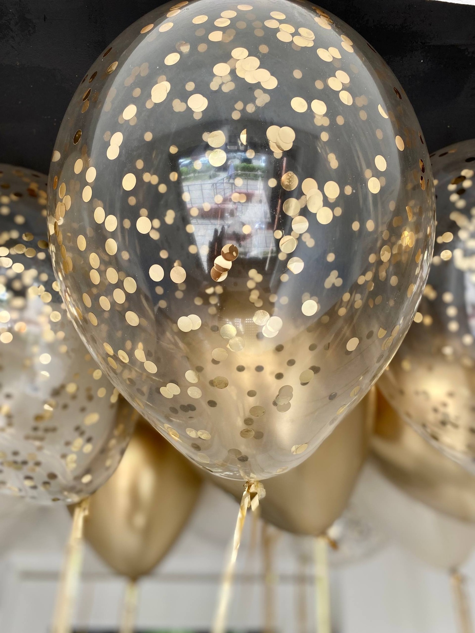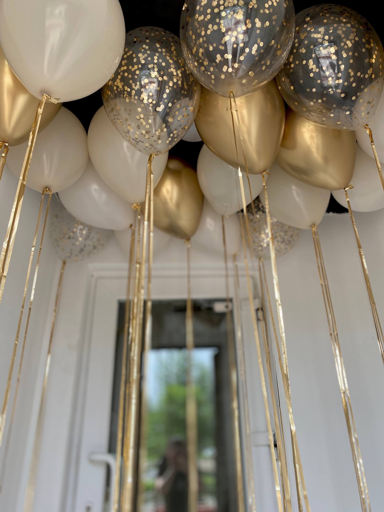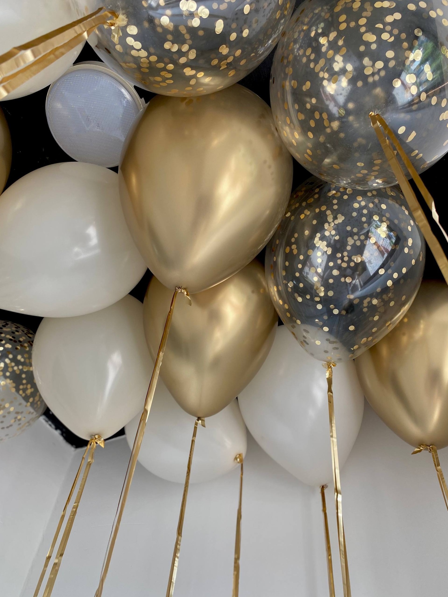 Воздушные шары под потолок с дождиком золото/белый песок №3384