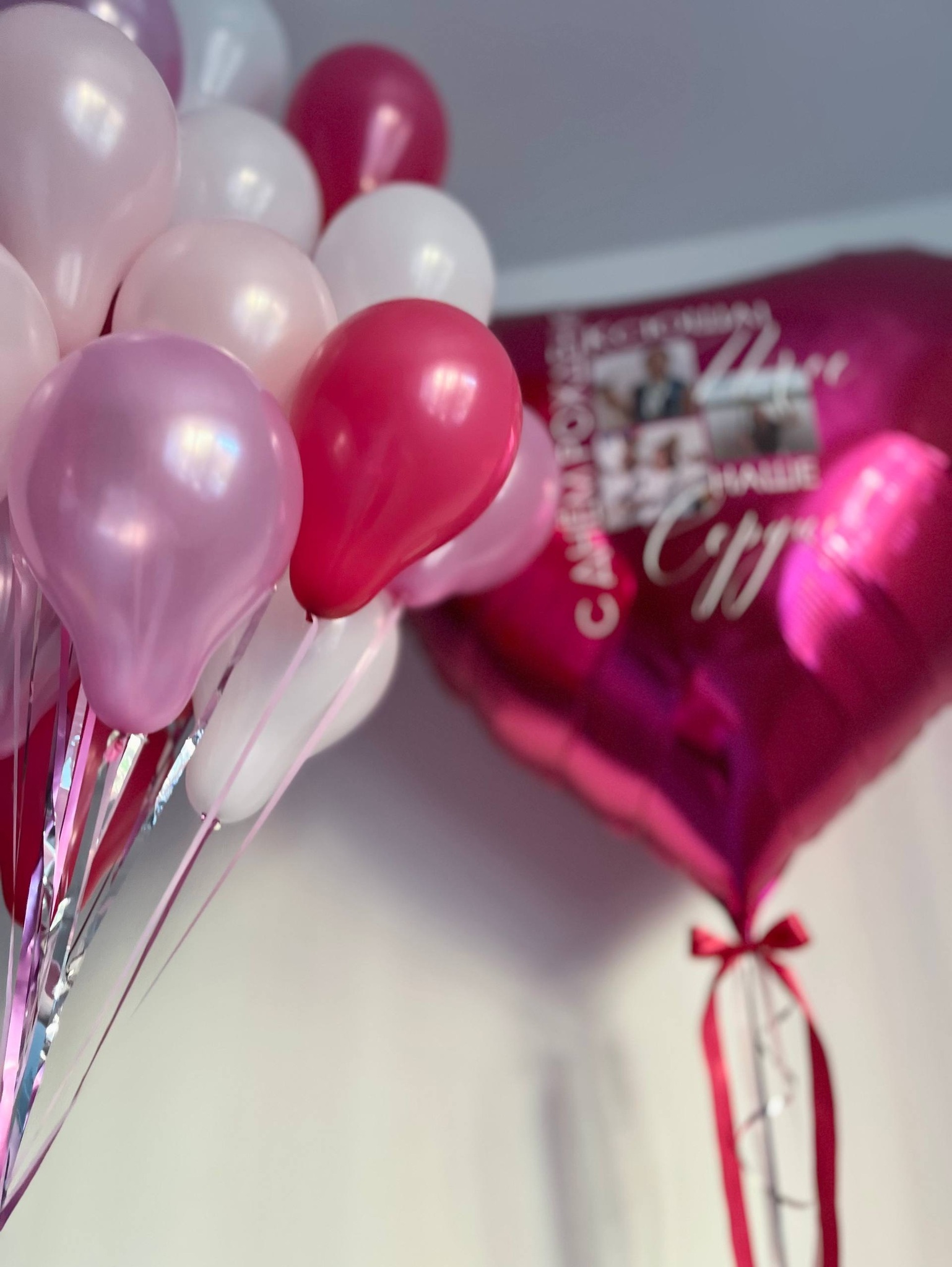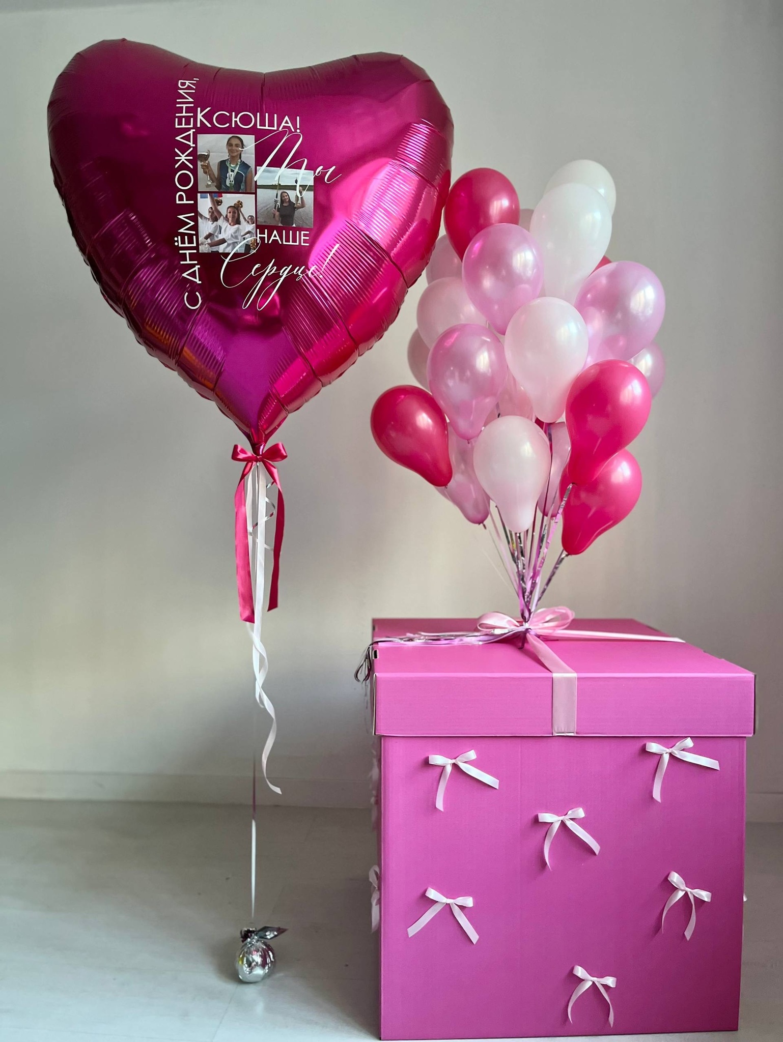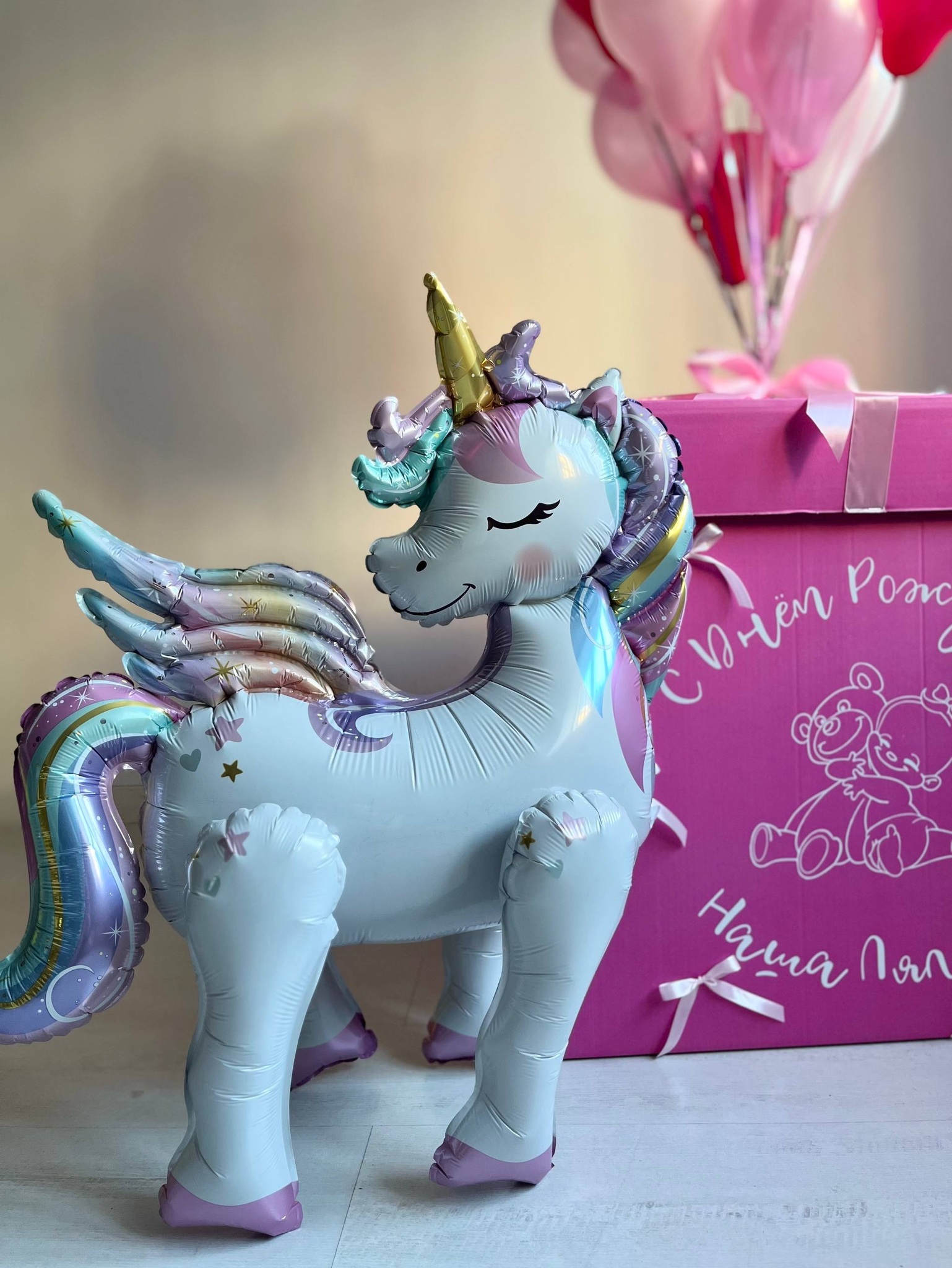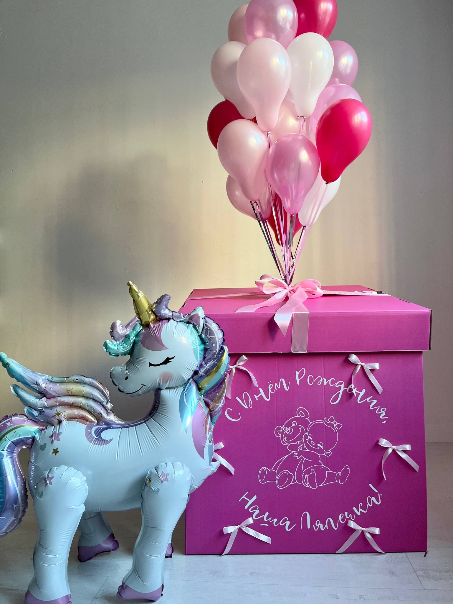Воздушные шары коробка сюрприз единорог фуксия/розовый/белый/малиновый №3405