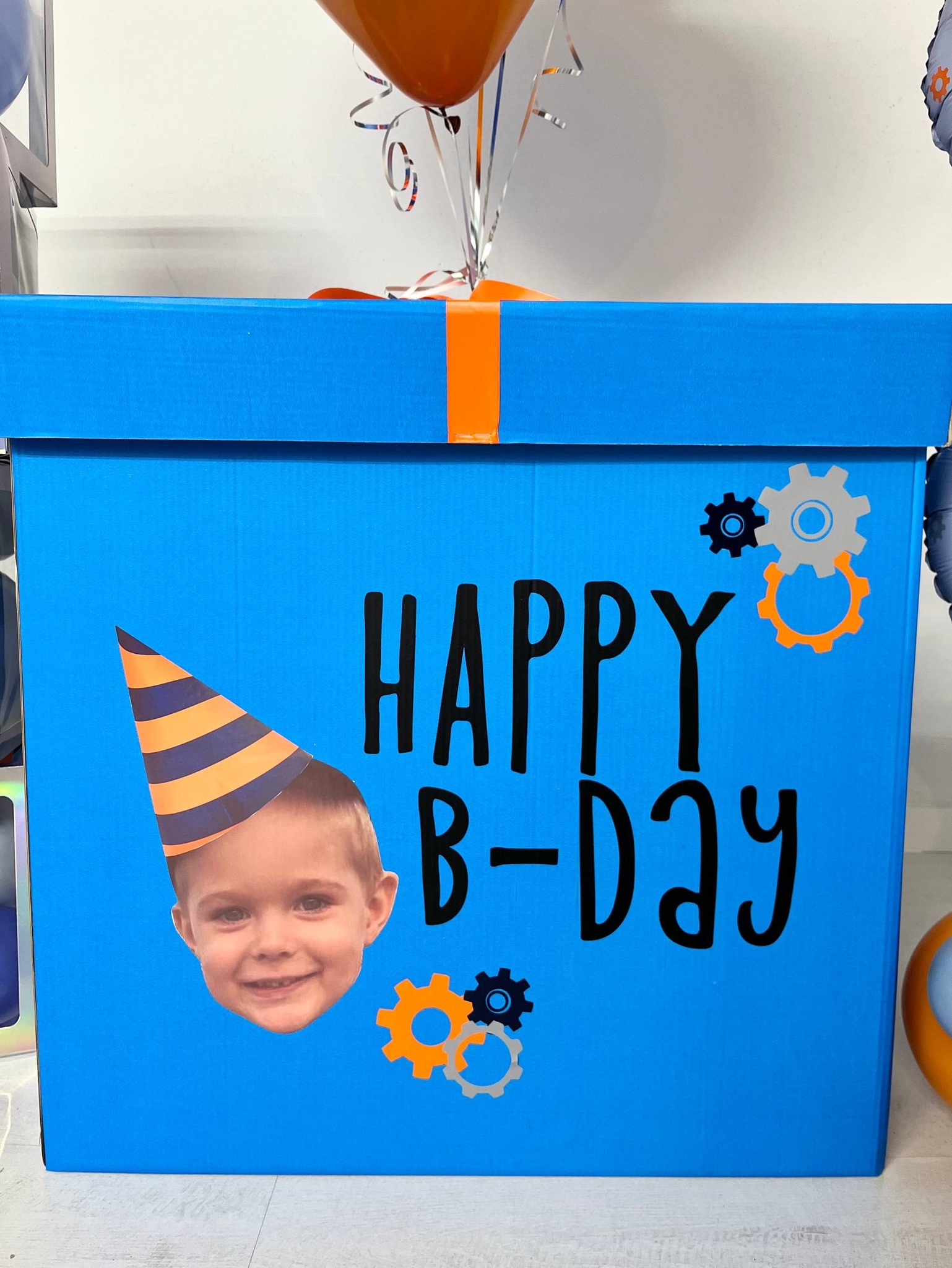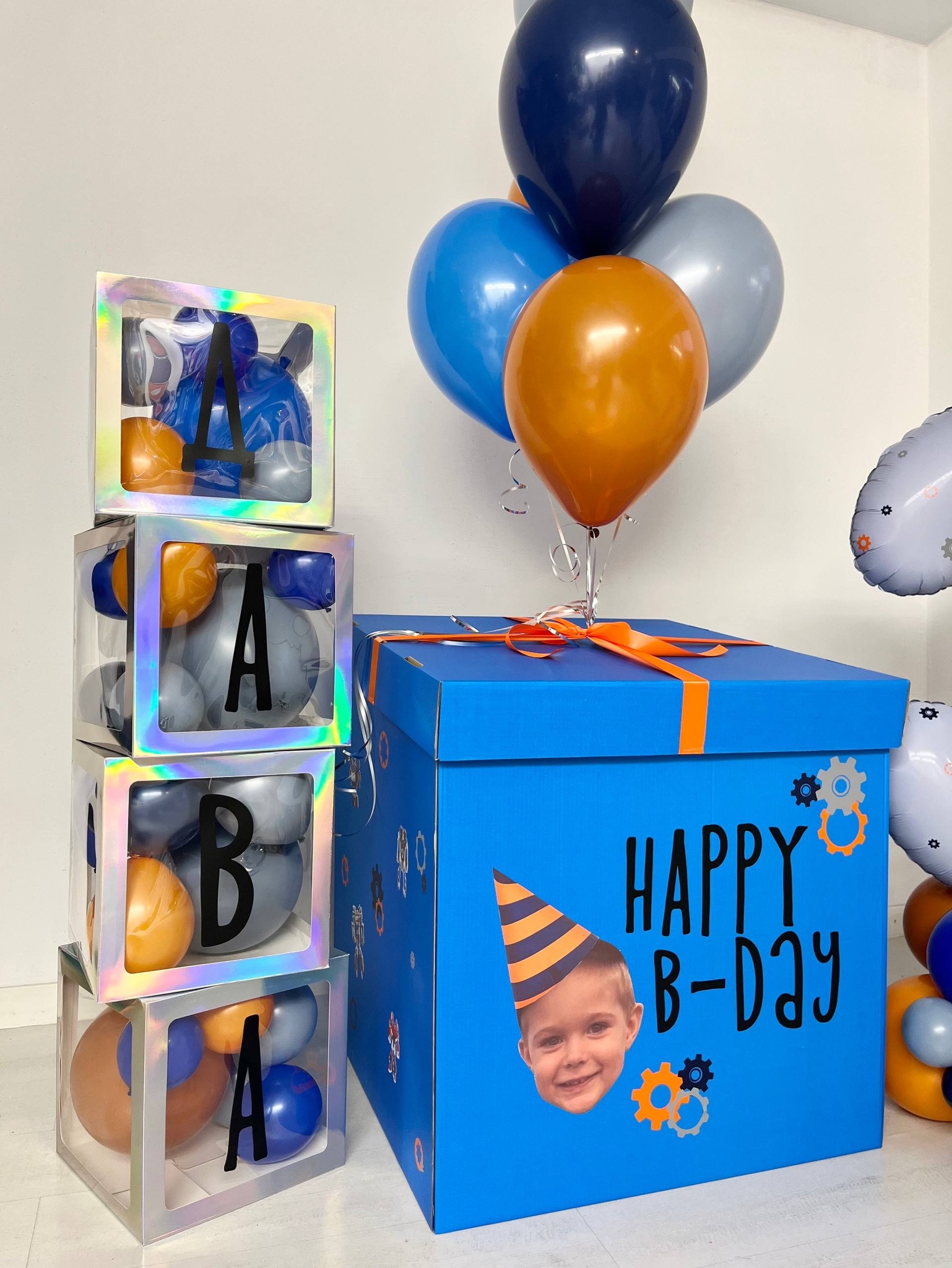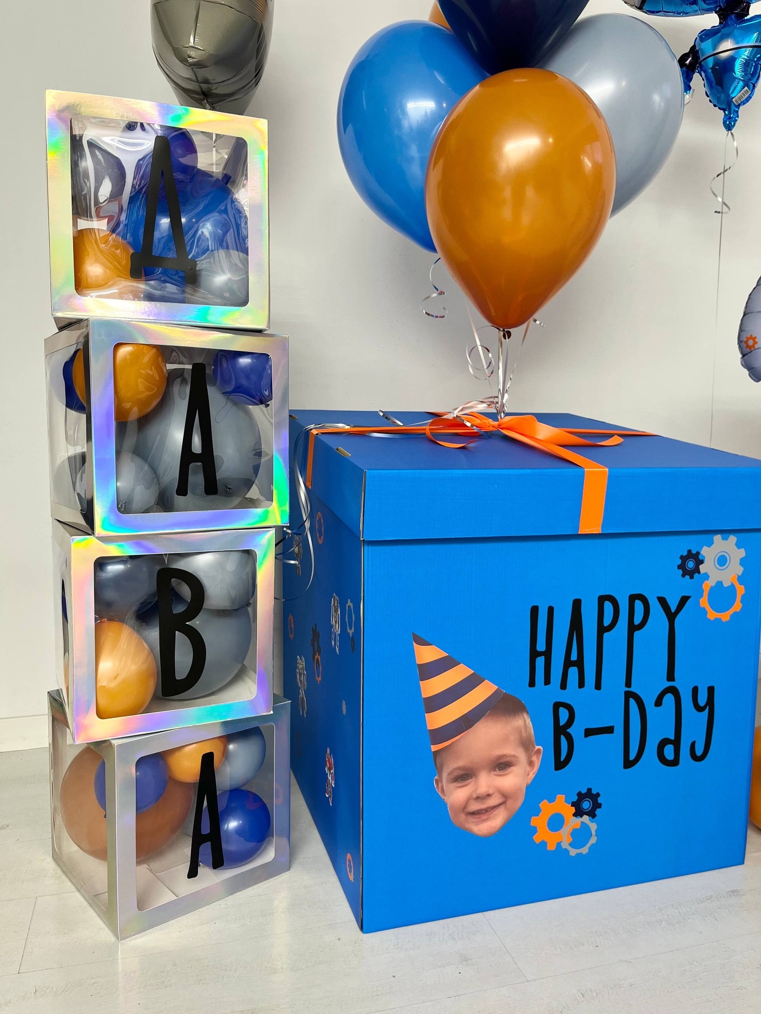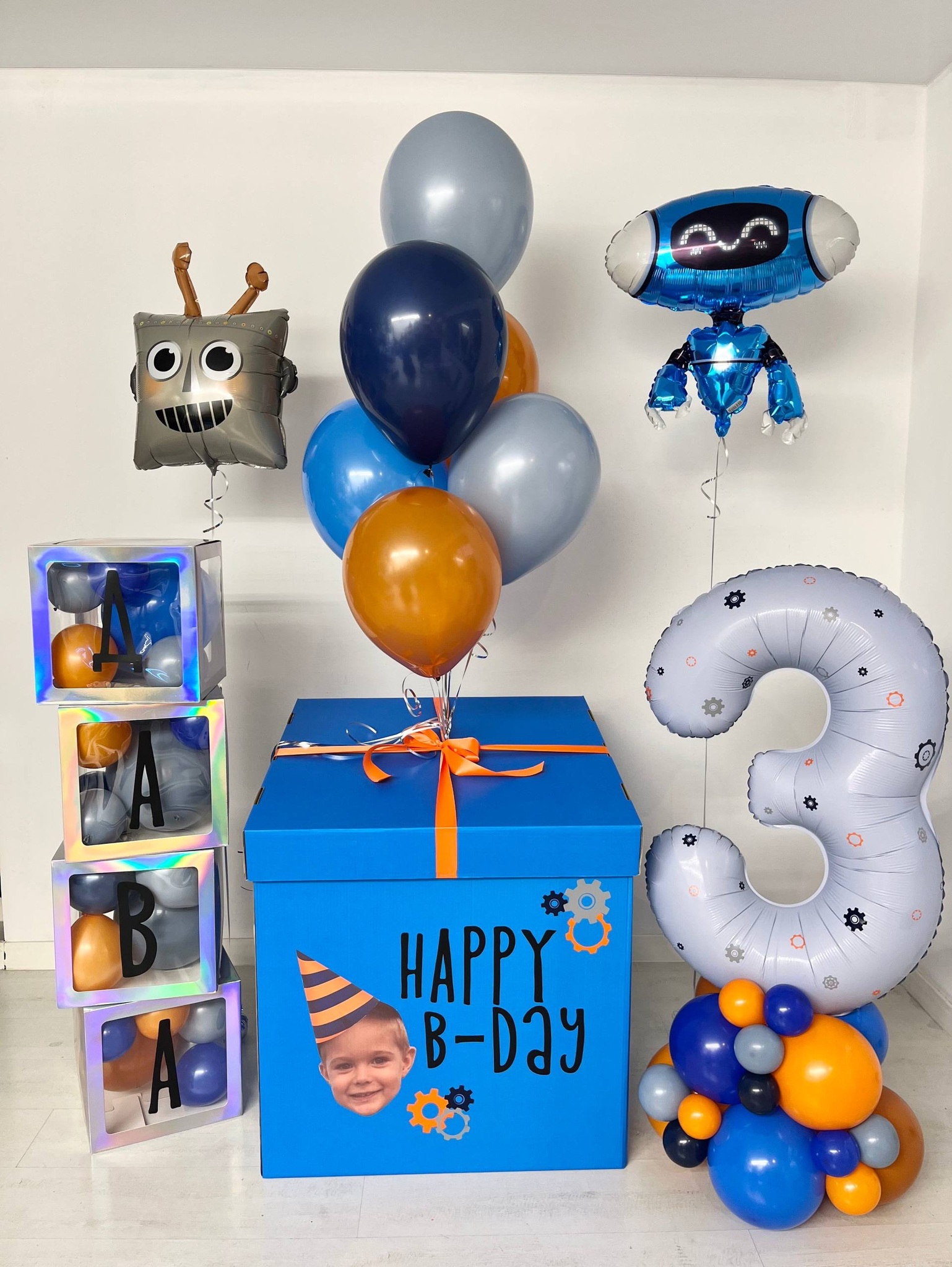 Воздушные шары на день рождения мальчика робот коробка сюрприз синий/пыльно голубой №3830