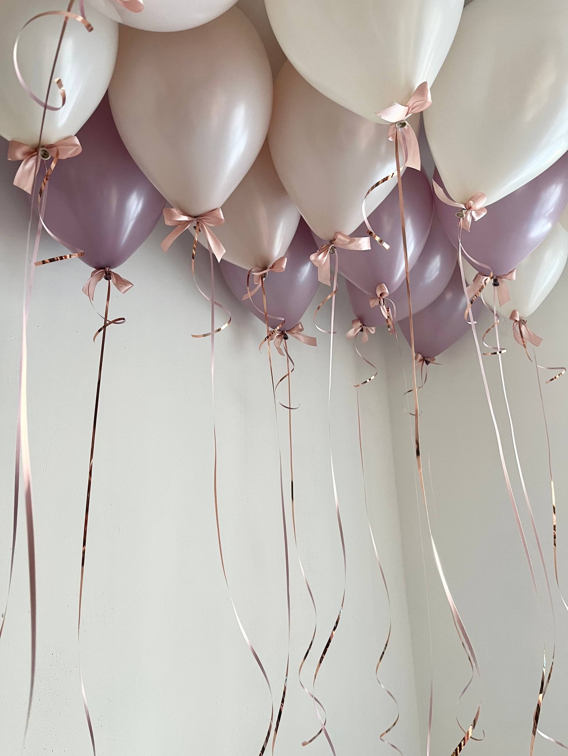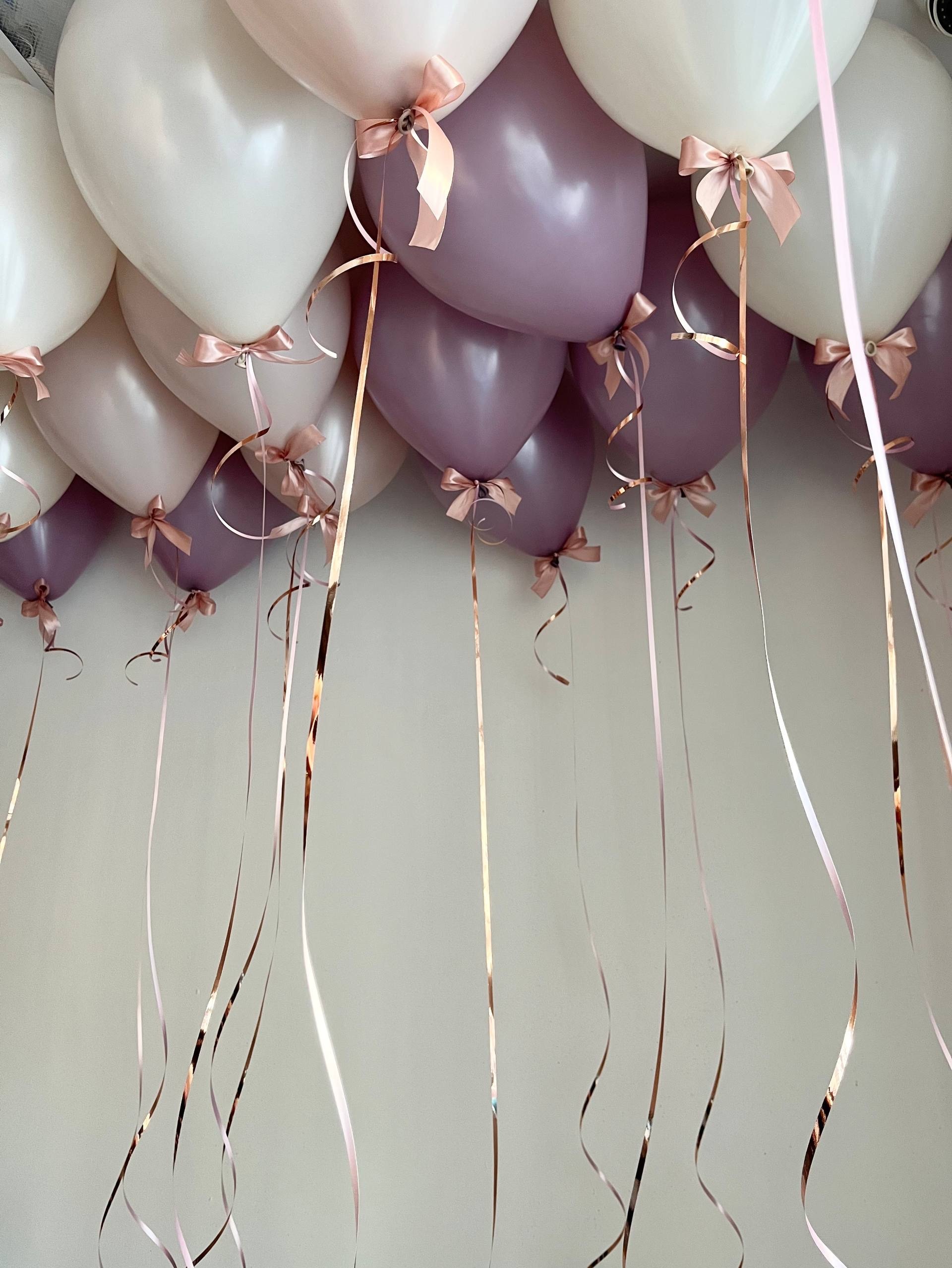 Воздушные шары под потолок с бантиками лаванда/пыльная роза/песок №4113