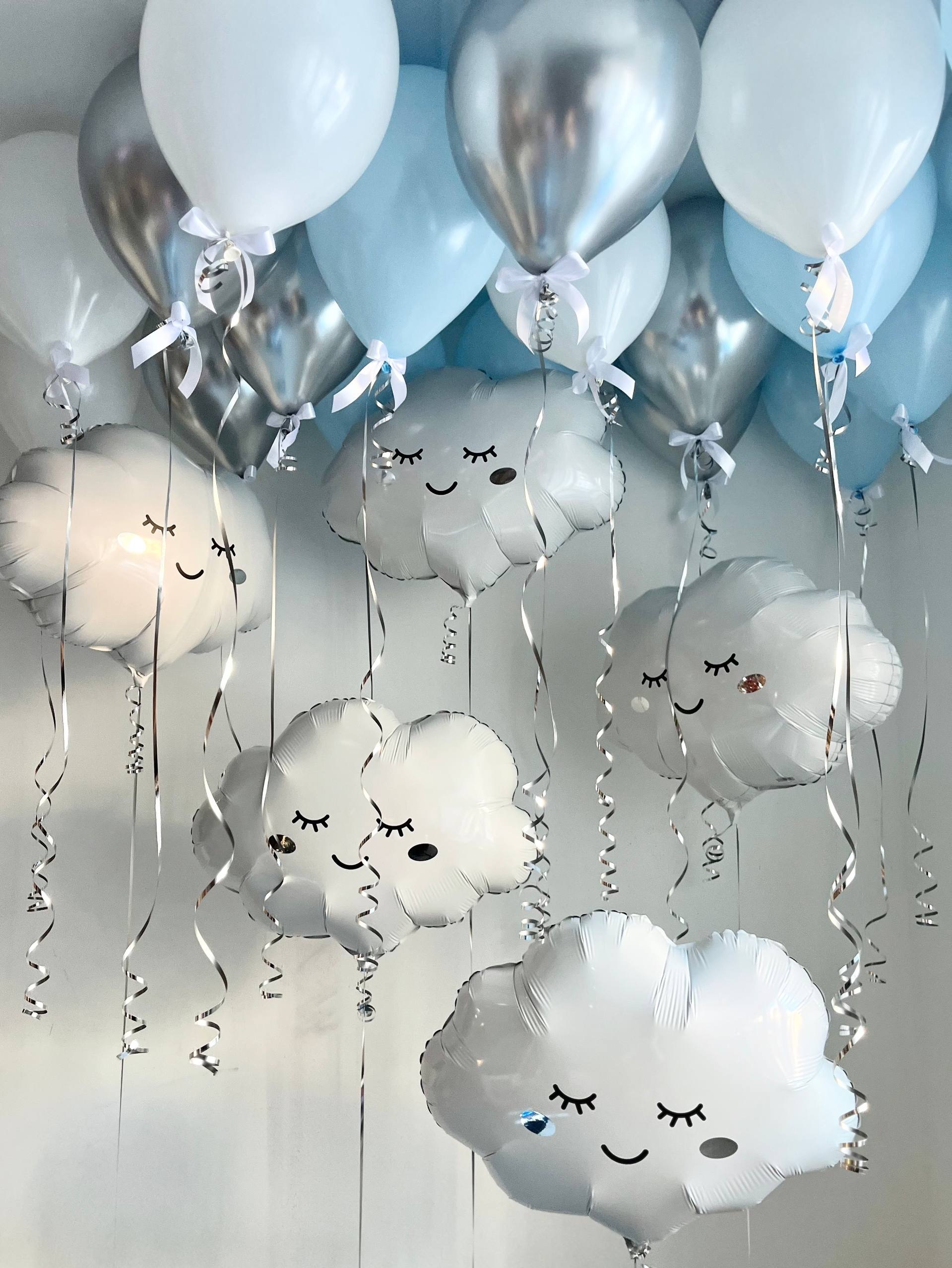 Воздушные шары на выписку из роддома облако голубой/белый/серебро бантики №4118