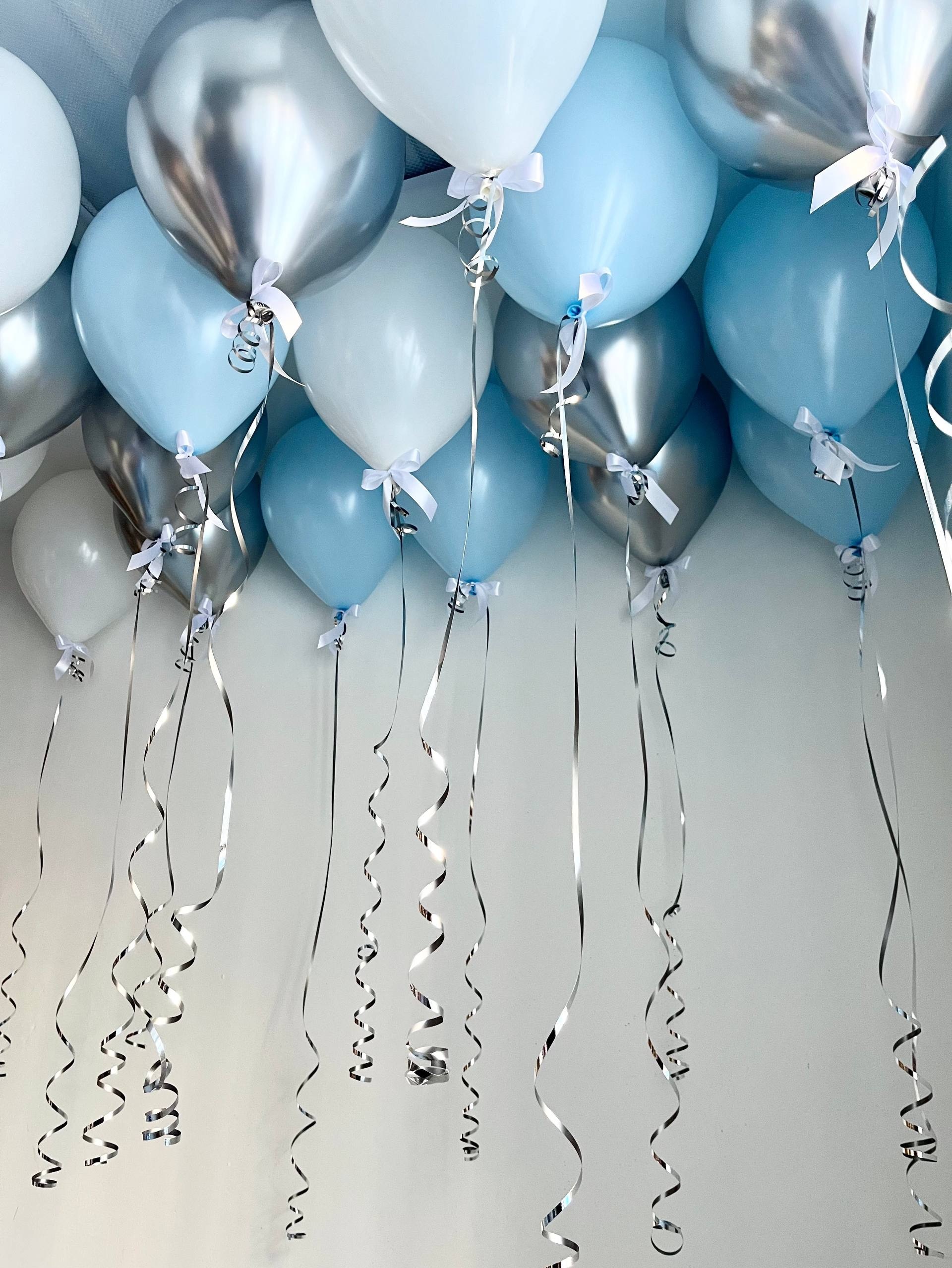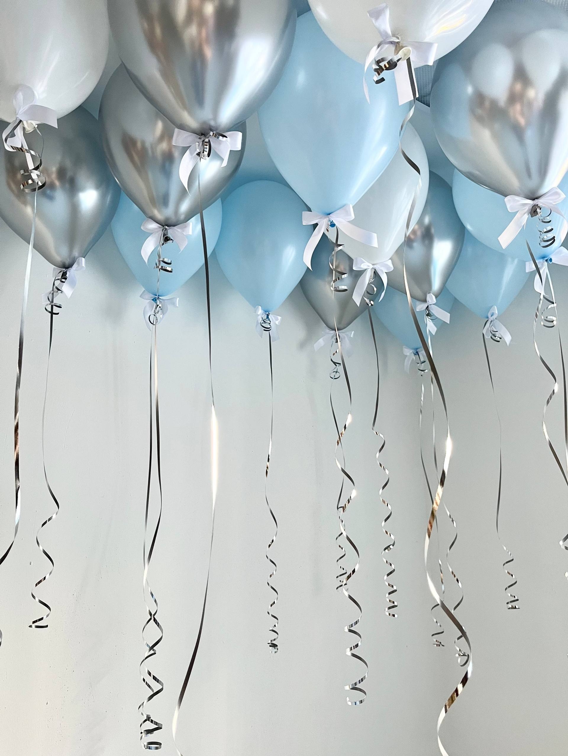 Воздушные шары с бантиками голубой/хром серебро №4119