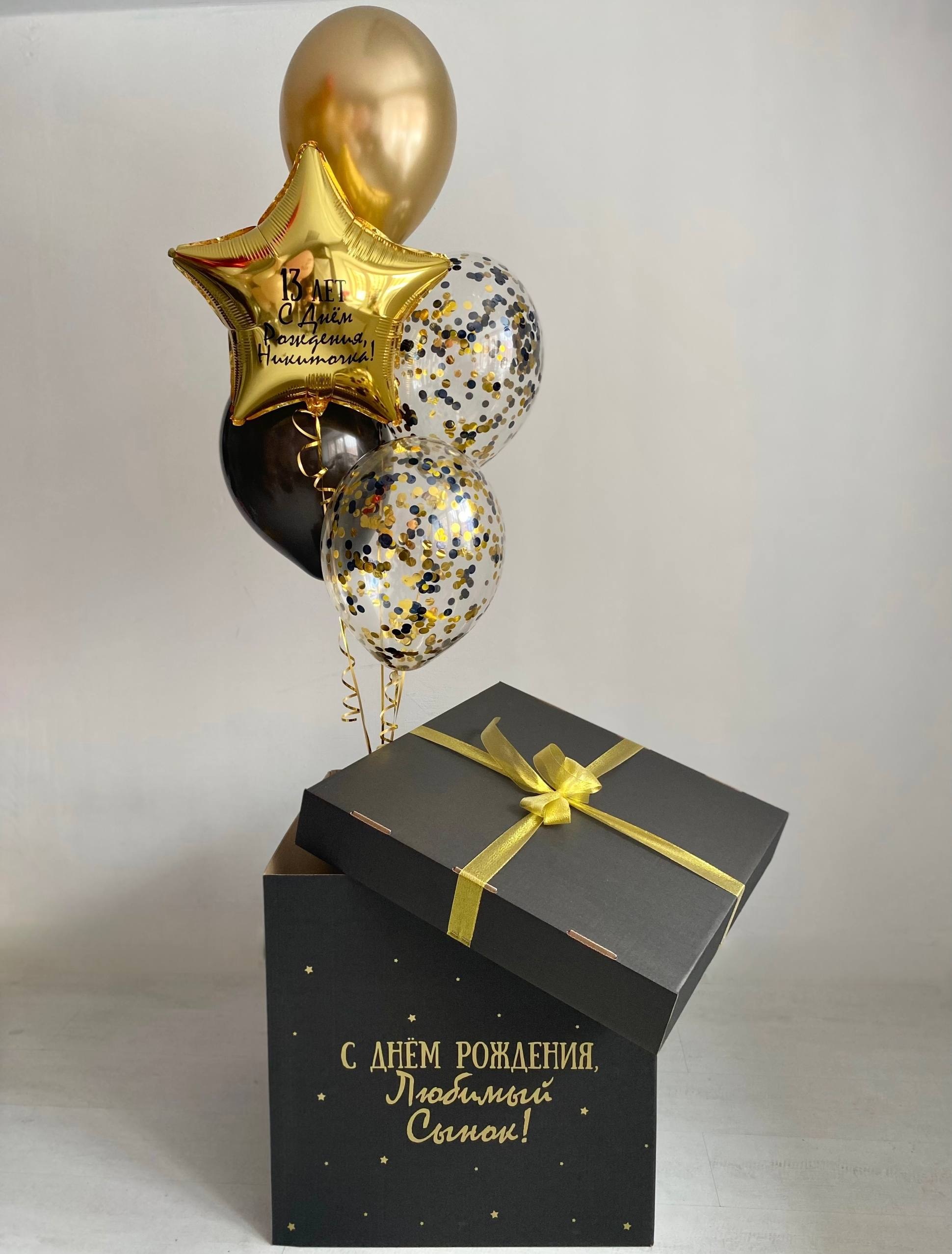 Воздушные шары золото/черный большая черная коробка сюрприз №4215